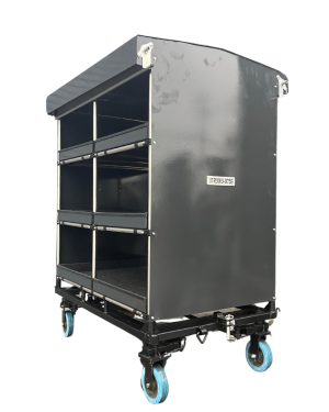 Carrinho para transporte de vidros com alojamentos em PVC injetado e lona superior retrátil.