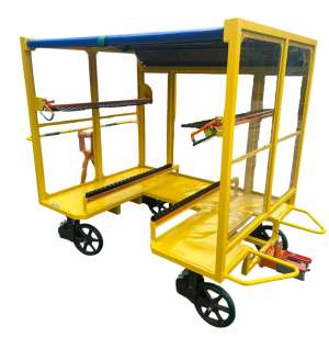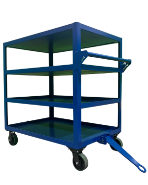 Carrinho feito em chaparia com bandejas e rebocador para movimentação de peças em geral.